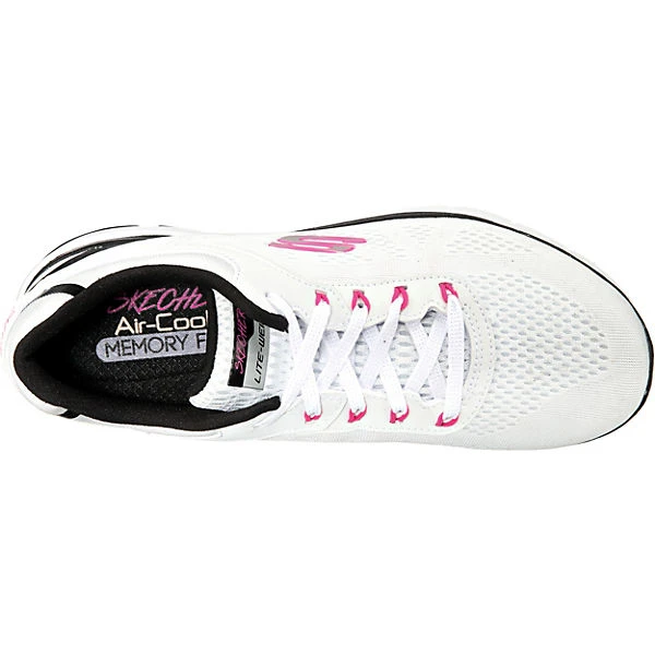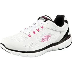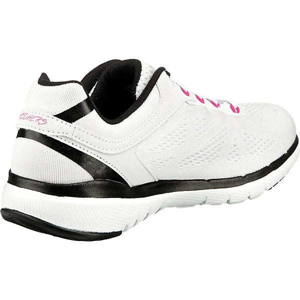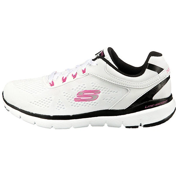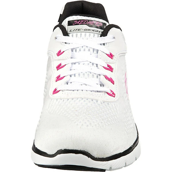 Skechers Flex Appeal 3.0 Schnürschuhe/ sportliche Halbschuhe/ Low Sneaker STEADY MOVE Weiß Textil-Synthetik-Mix – Flachmesh in Feinstrickoptik – verstärkter Fersenbereich – geringes Gewicht – gepolsterter Einstieg – Ferse und Seite gelabelt – gepolstertes Memory-Foam-Fußbett – schwarze und weiße Zierstreifen – flexible, rutschhemmende Laufsohle