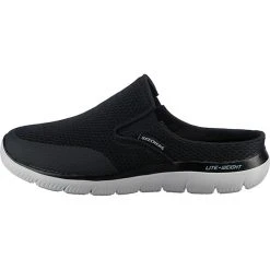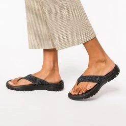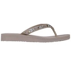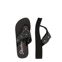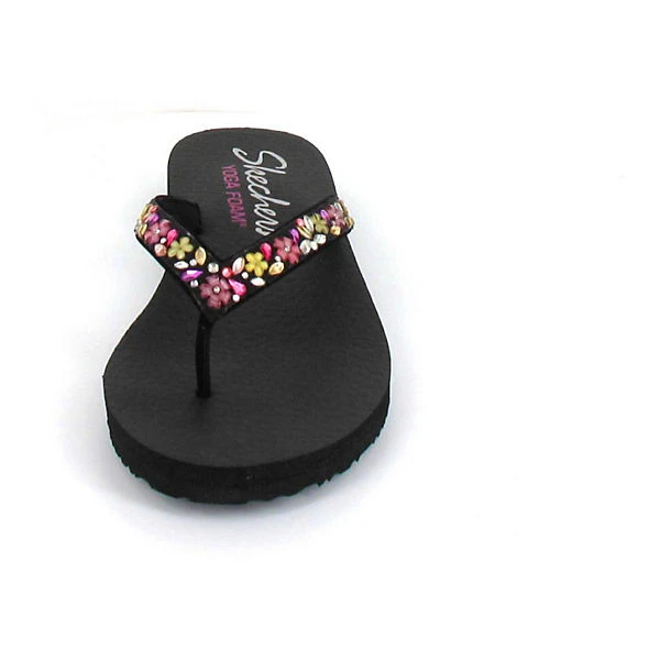 – leichte Zehentrenner-Pantolette für Damen von Skechers für heiße Sommertage – das mit bunten Glitzersteinchen dekorierte Obermaterial sorgt für einen effektvollen Auftritt – hoher Tragekomfort durch die weiche “ Yoga Foam “ Sohle – rutschhemmende Laufsohle