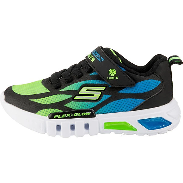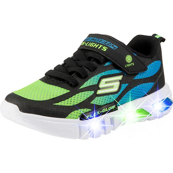 Aus der Skechers S Lights-Reihe stammen die Kinder Sneaker Flex Glow Dezlo in Schwarz Multi. Diese sind in einem Mix aus Textil und Synthetik gefertigt und sind bestens geeignet für Sport und Freizeit. Eingearbeitete Blinklichtern in der Sohle tragen zu einem coolen Auftritt bei. Weitere Details: Zuglasche, weiche Fütterung, softe Decksohle, Klettriemchen und leichte Laufsohle – atmungsaktiv