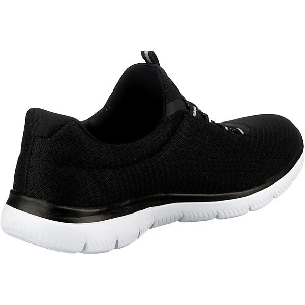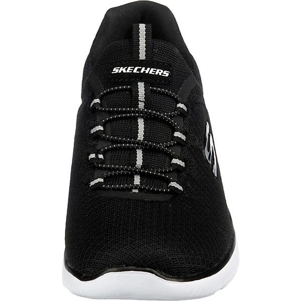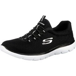 Aus der Skechers Sport-Kollektion stammen die Damen Slip-On-Sneaker Summits aus schwarzem Textil mit Logodetails, Zuglasche an der Zunge und Elastikschnürung. Eine Memory Foam Decksohle spendet hervorragenden Tragekomfort. Die sportliche leichte flexible Laufsohle rundet das Gesamtbild dieser Sportschuhe ab.